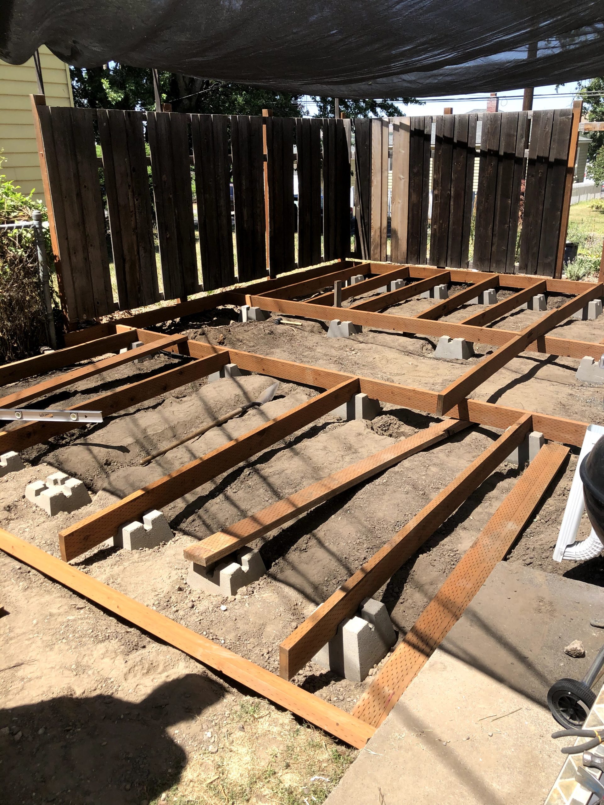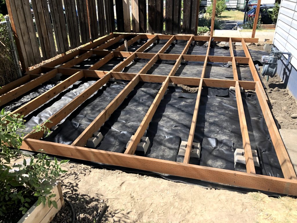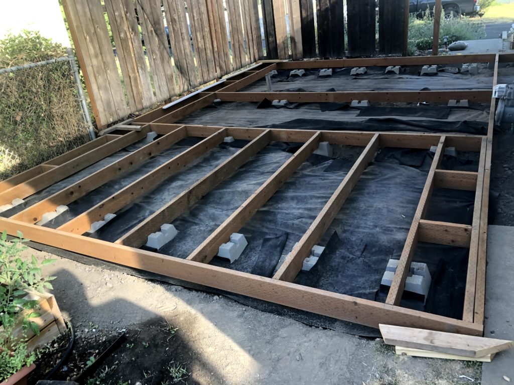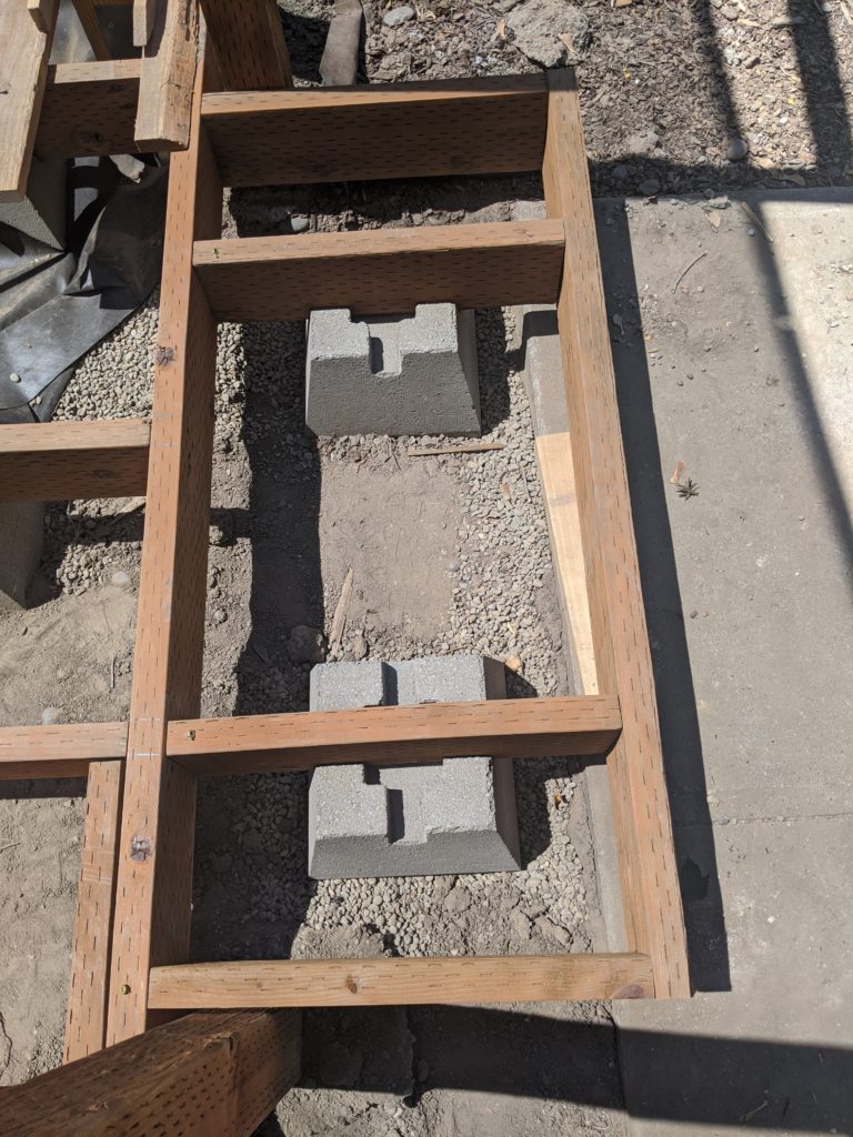 The length of each pair of sides of the framing matched so it was a parallelogram rather than a rectangle. All we had to do was wedge one corner of it over to make it square. We had already put down some weed block over the dirt at this point so had to move some of that back to get to several of the deck blocks. We dug on one side of 6 of the beam blocks in the middle and unscrewed a few places where the framing was attache to the fence. We used a big pry bar to lever the whole thing over a few times until we had it (mostly) square.