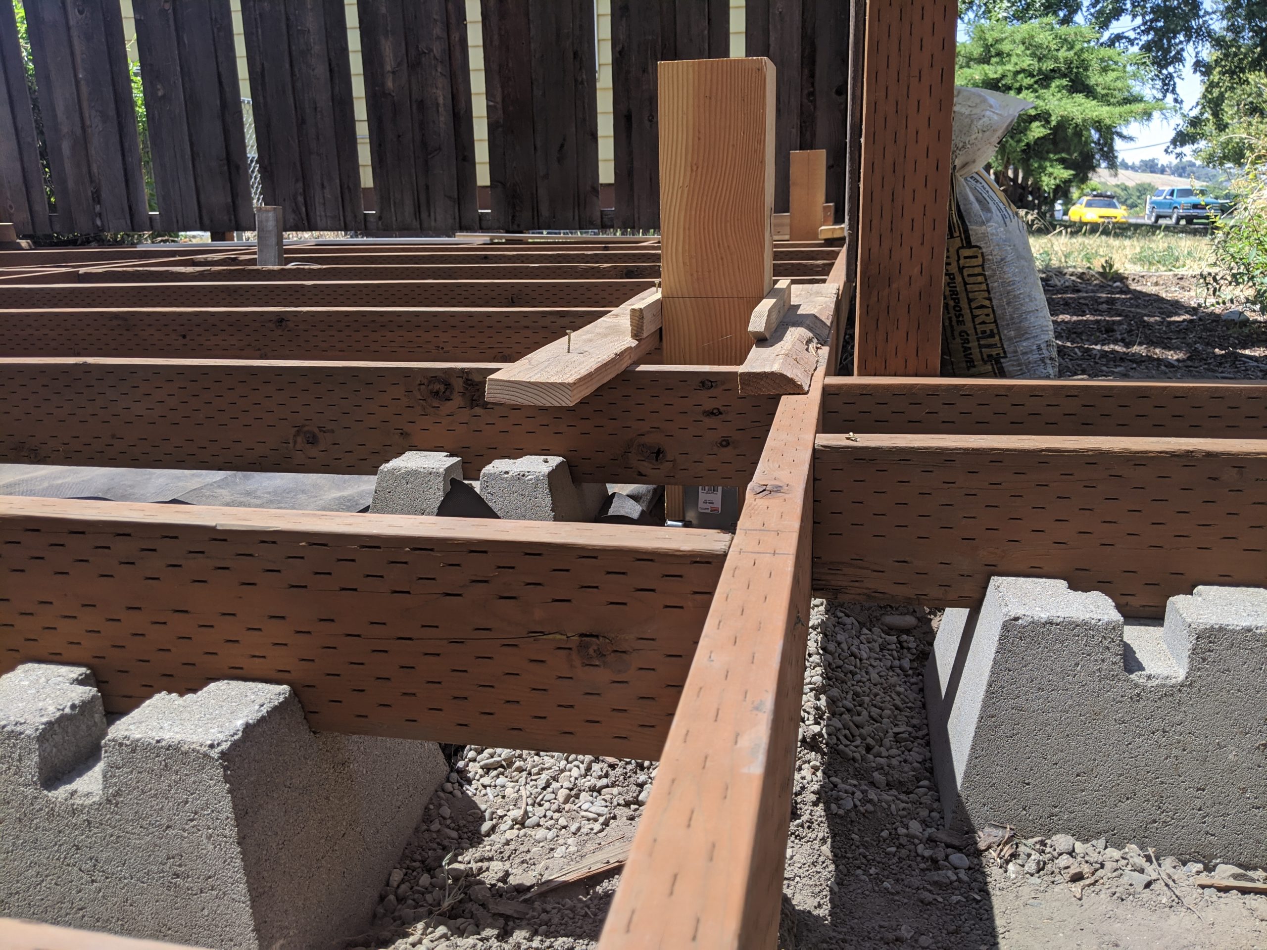 After getting most of it cut and together we held off on installing joist hangers. so we could spend some time squaring and leveling. At this point everything looked great but was not level. It took most of a day to work out where we had to raise and lower the deck blocks to make it right. After we had it level we starting screwing more framing together but held off on the joist hangers and corner brackets.
