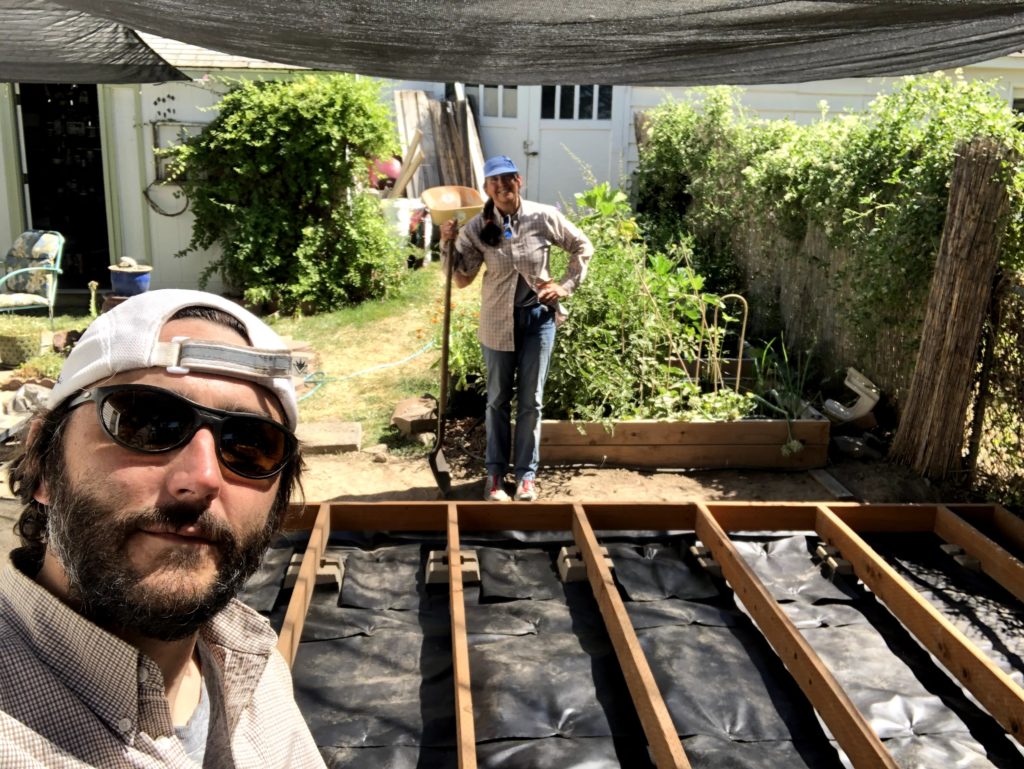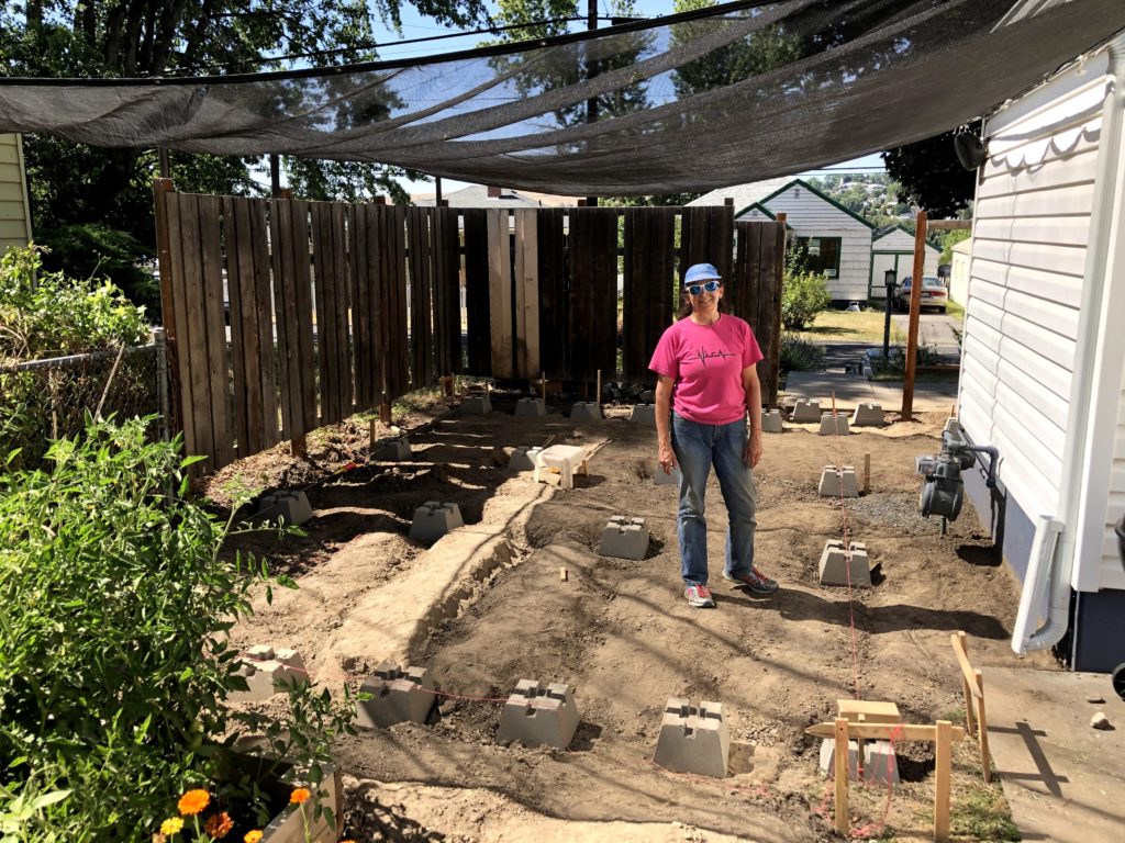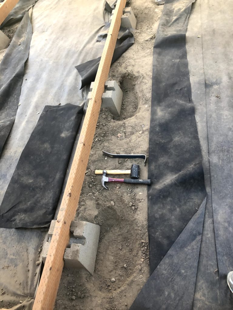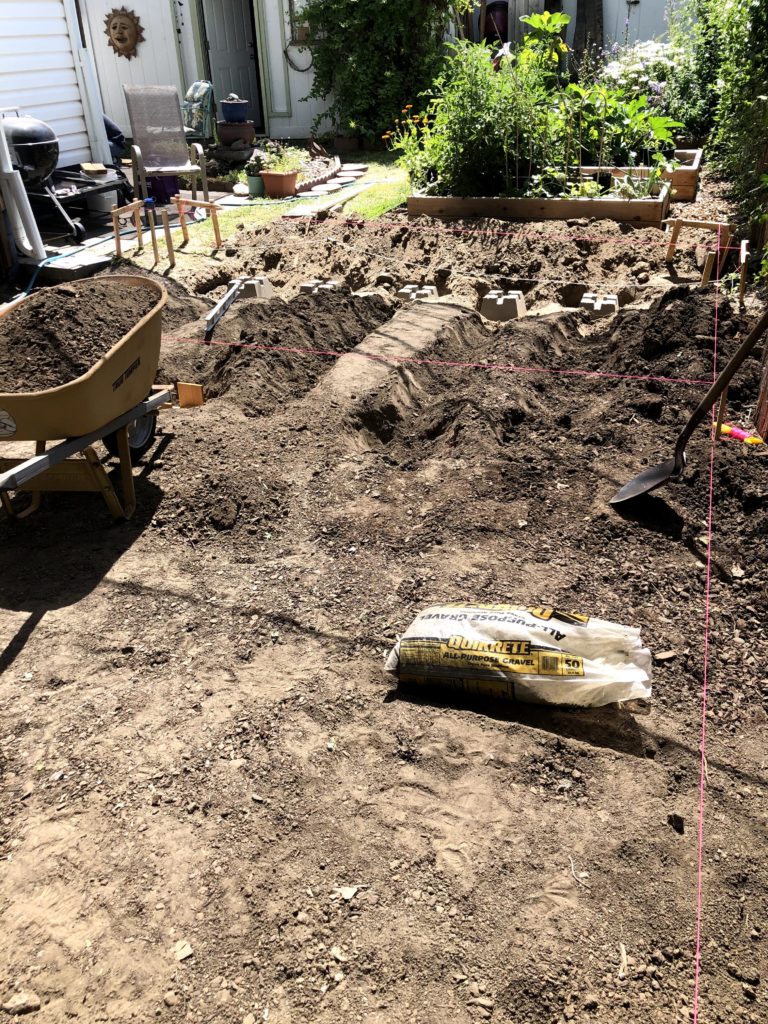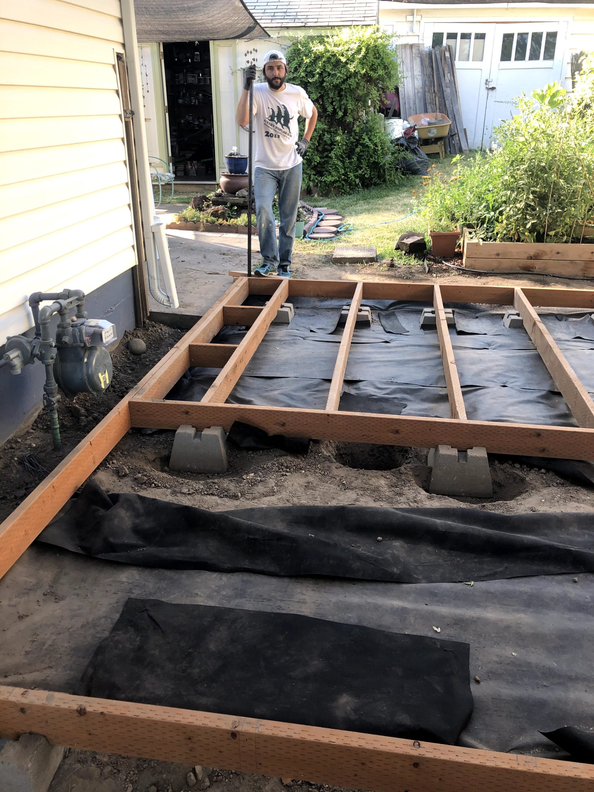This step took the better part of a day and we were hot, frustrated and not sure how the whole thing was going to work out. We discussed and decided that maybe we didn’t need the level in the back to be the same as the patio. If we allowed for a step up in the back it would make setting the blocks much easier. And we wouldn’t have to dig any trenches for joists. It was time to start over.