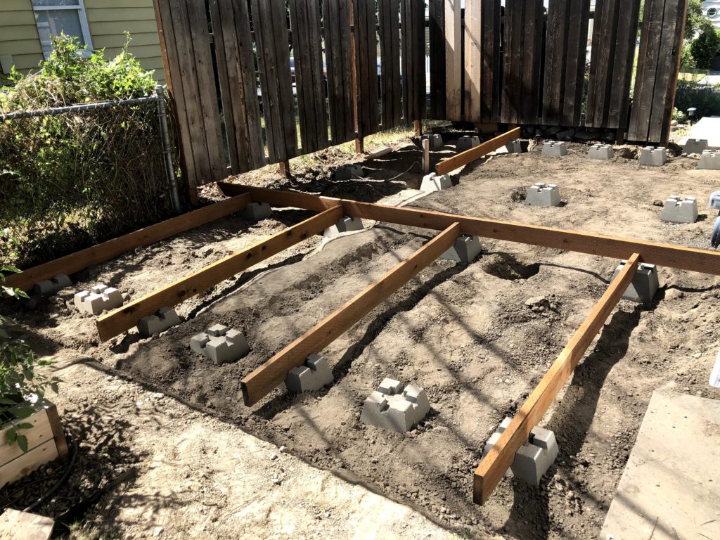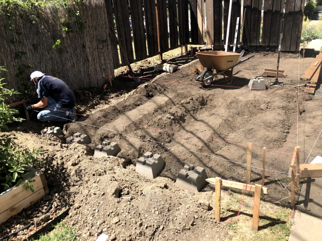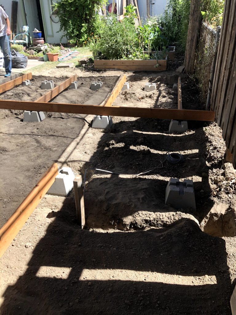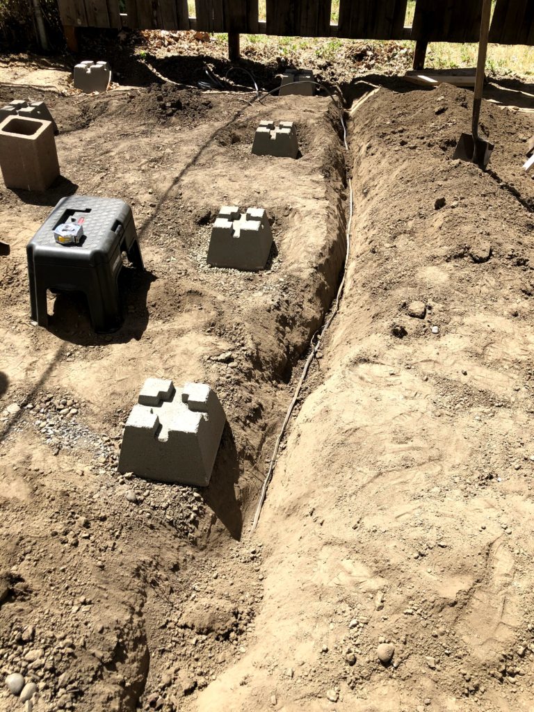The ground was high enough in the back that we had to dig to set the first row of blocks. We dug and tamped holes for each block, 7 of them, and kept them in line and level using the string. It was harder than we thought and trying to change the level of a deck block while it’s in a hole is not easy. We used some 3/4″- gravel in the base of the holes hoping we could wiggle the blocks to make them go down and add more gravel if they needed to go up. It worked, sort of, but took a long time to set those first 7. We also realized that the ground was high enough in the back that the 2×6 framing would need to be slightly below ground level. We dug trenches where the framing would go and started to set the next row of blocks where the beams would go.