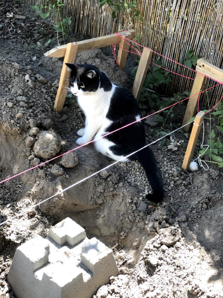 Since the yard slopes down toward the front of the house we expect there to be a step up at the front, where the gate is, and our original plan was to make the back at the same level as the concrete existing patio . We started by using string lines and various line levels to set the corners of the deck and figure out the correct height in the front. We used that as a guide for how to set the deck blocks.