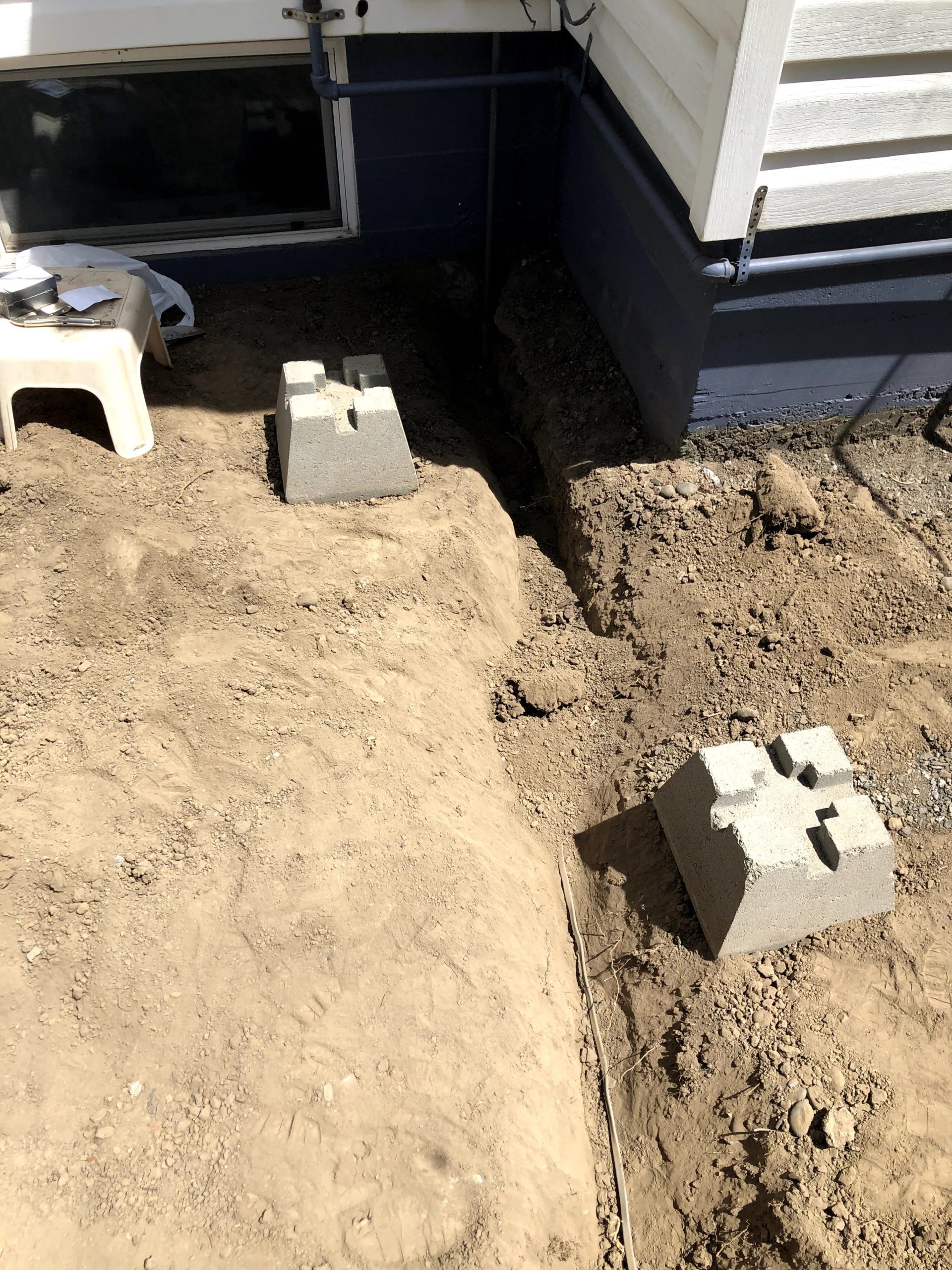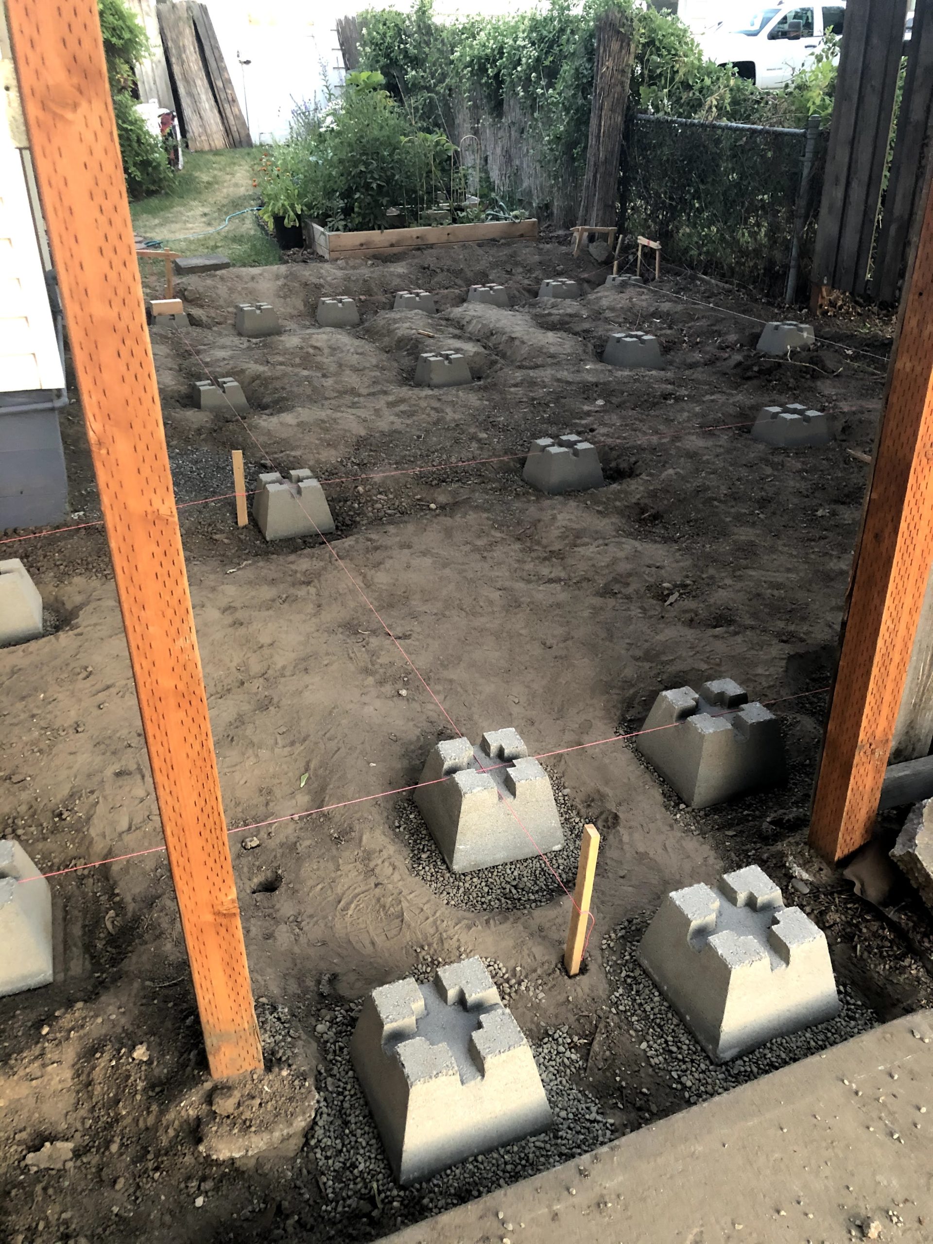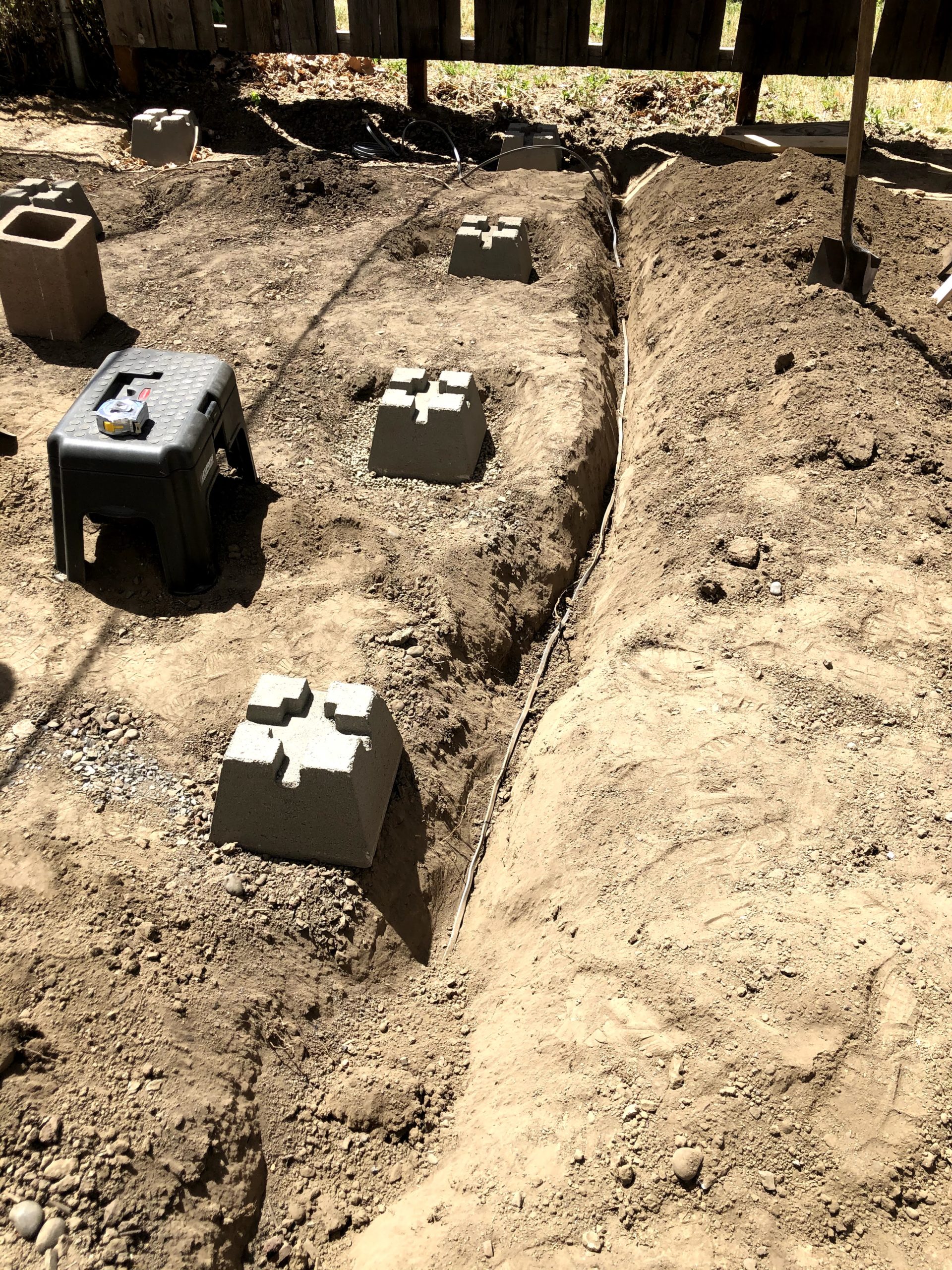 We dug out the original blocks and raised them all up. They still had to sit in a slight depression but the tops of the blocks where the joists sit were high enough off the ground that we could fill in our trenches.