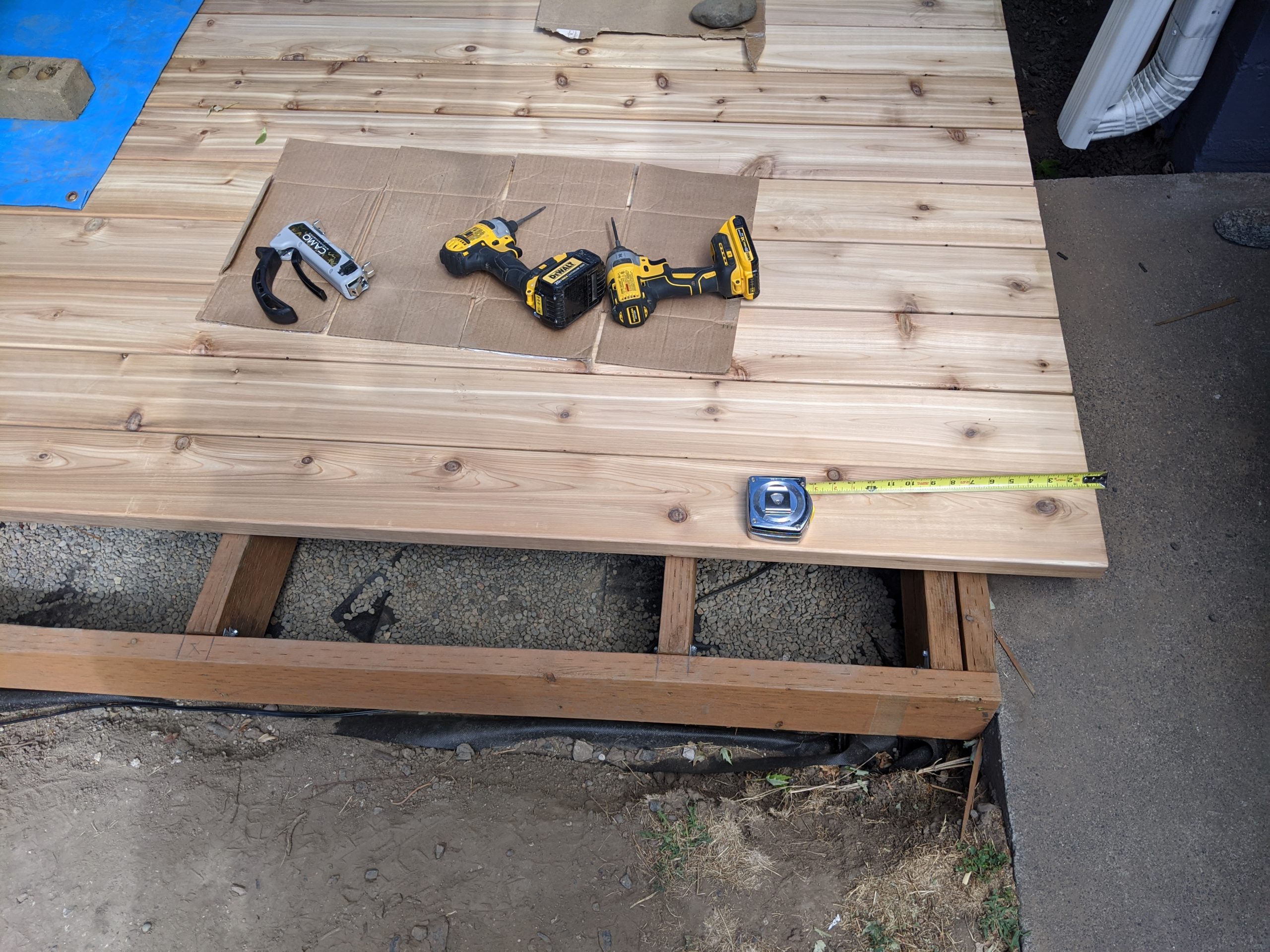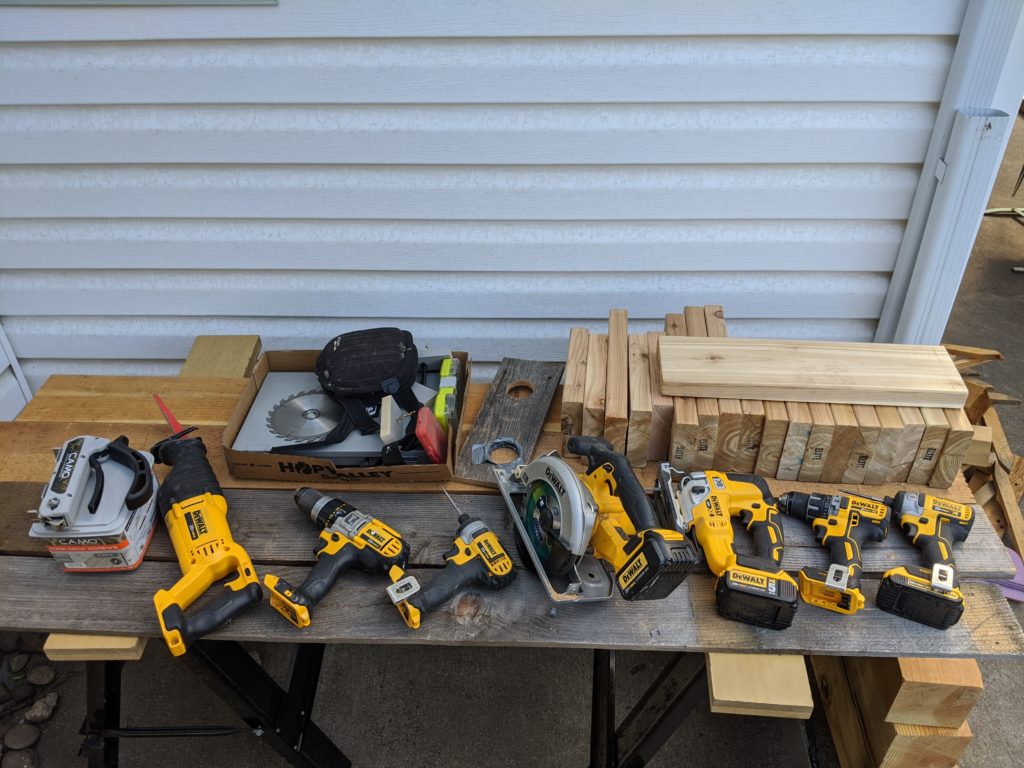 Cordless tools for job. This project is not sponsored by DeWalt. See the Camo guide and screws on the left.
