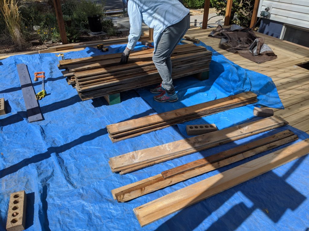 We discovered that this was a slow process. We cut all of the boards for each section together, then ripped 3 boards for the top part. We ended up using 10 full boards plus 7 thinner strips in each section.