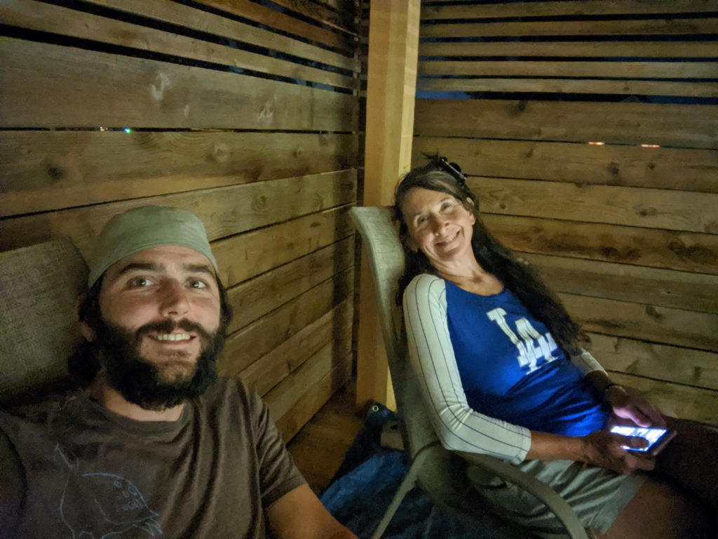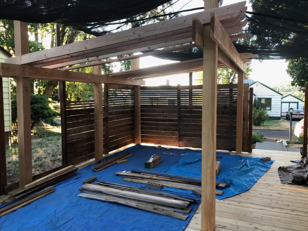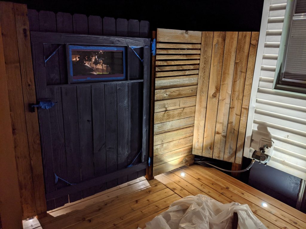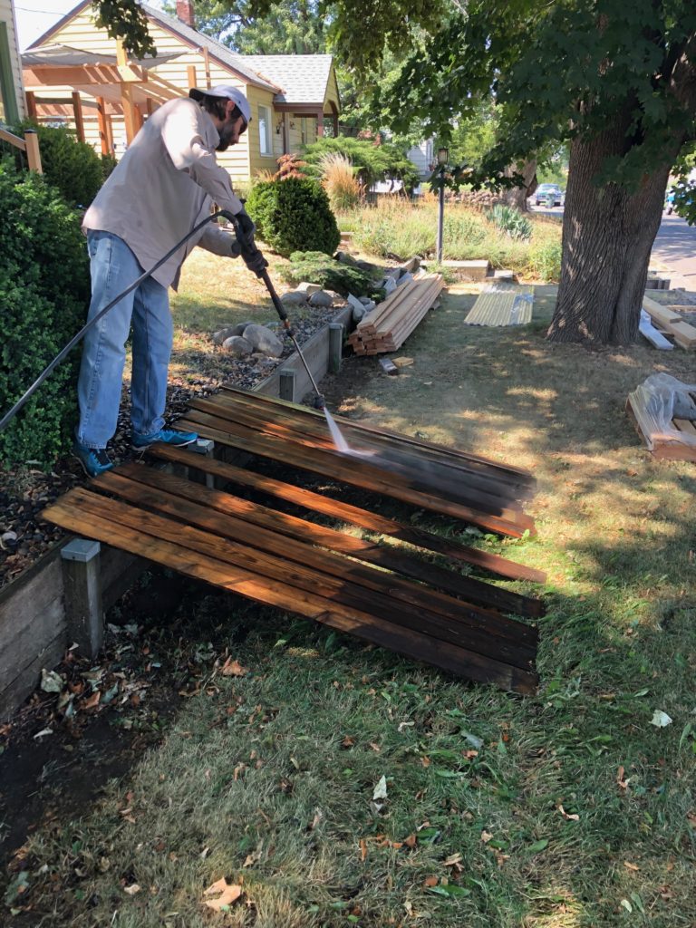 This definitely had a “corral” kind of vibe that neither of us were into. We tried to imagine the whole thing purple but weren’t sure how that would work either. We realized that whatever we did, paint or stain, the boards needed to be cleaned. We tried sanding a few and that did work, sort of, but didn’t get the grey and dirt out of the deep valleys of cedar grain. Fortunately our neighbor owns a pressure washer and let us borrow it!