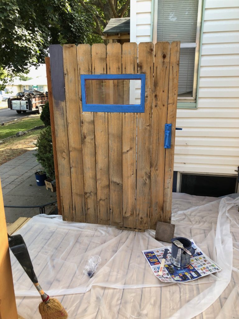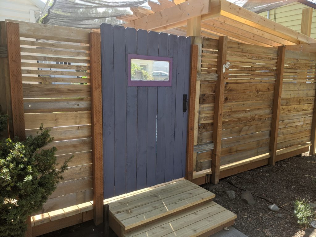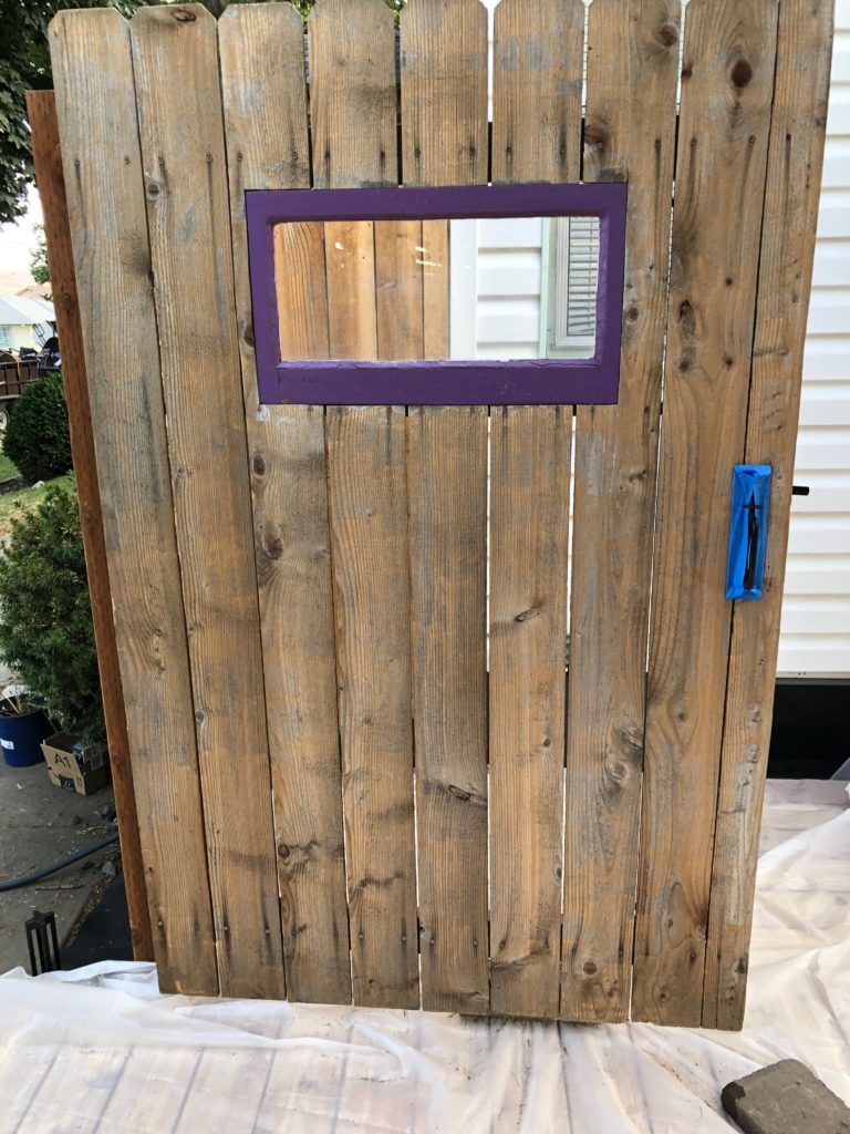The final step for fence assembly is to install the old gate. We had forgotten to clean that so got the pressure washer back out and the gate cleaned up nicely. We are still thinking about what to do with the main part of the fence (paint or stain) but we both liked the idea of using our purple highlight on the gate. We had already included a purple window when we originally built it. Notice that the boards are vertical here. It was already built and didn’t want to take it apart and rebuild it.