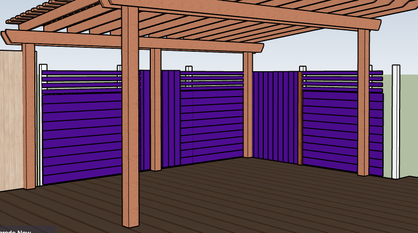 We had done some idea-hunting online and both liked the idea of using some horizontal fencing. We settled on a plan to do alternate sections of horizontal and vertical fencing, and do it in a way that would allow us to use the original fencing material. Given the cost of the project so far we really didn’t want to get rid of all of that wood (over 80 fence boards) and buy all new cedar fencing. As you can see in the shot above the old wood was grey, dirty and not very appealing. We have some purple highlights on the base of our house and in the fence so we thought one option is to just paint it and not worry about keeping the natural wood color. Here’s a mock-up we created:
