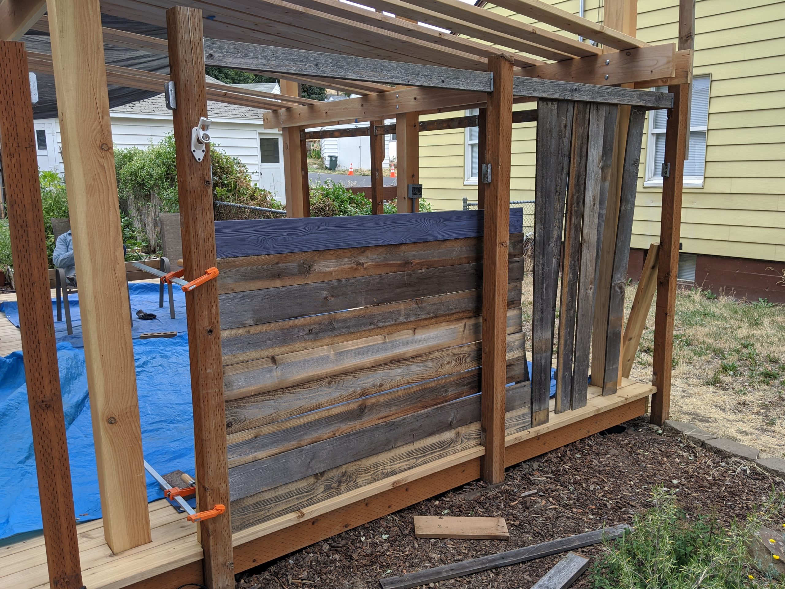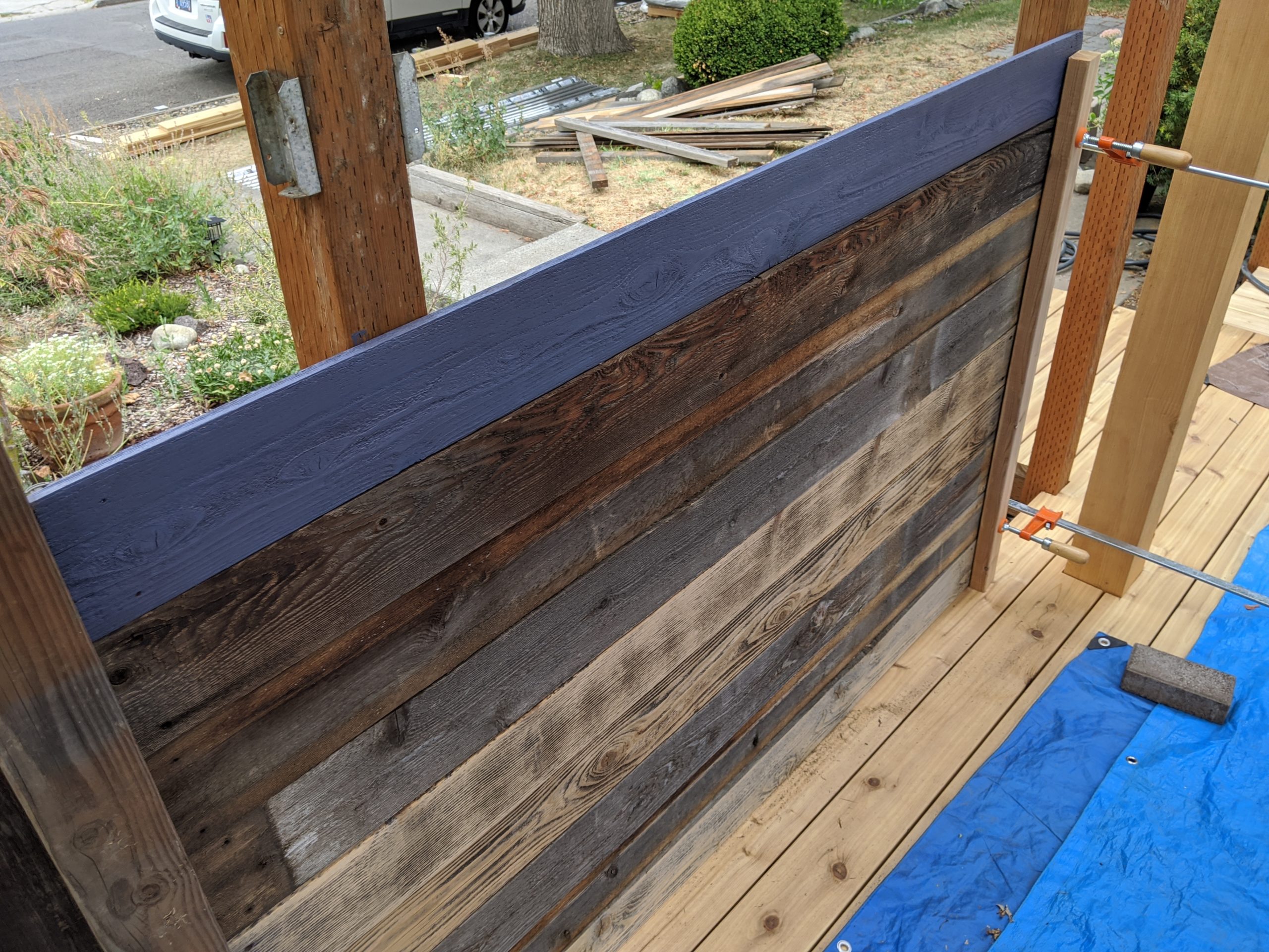 This definitely had a “corral” kind of vibe that neither of us were into. We tried to imagine the whole thing purple but weren’t sure how that would work either. We realized that whatever we did, paint or stain, the boards needed to be cleaned. We tried sanding a few and that did work, sort of, but didn’t get the grey and dirt out of the deep valleys of cedar grain. Fortunately our neighbor owns a pressure washer and let us borrow it!