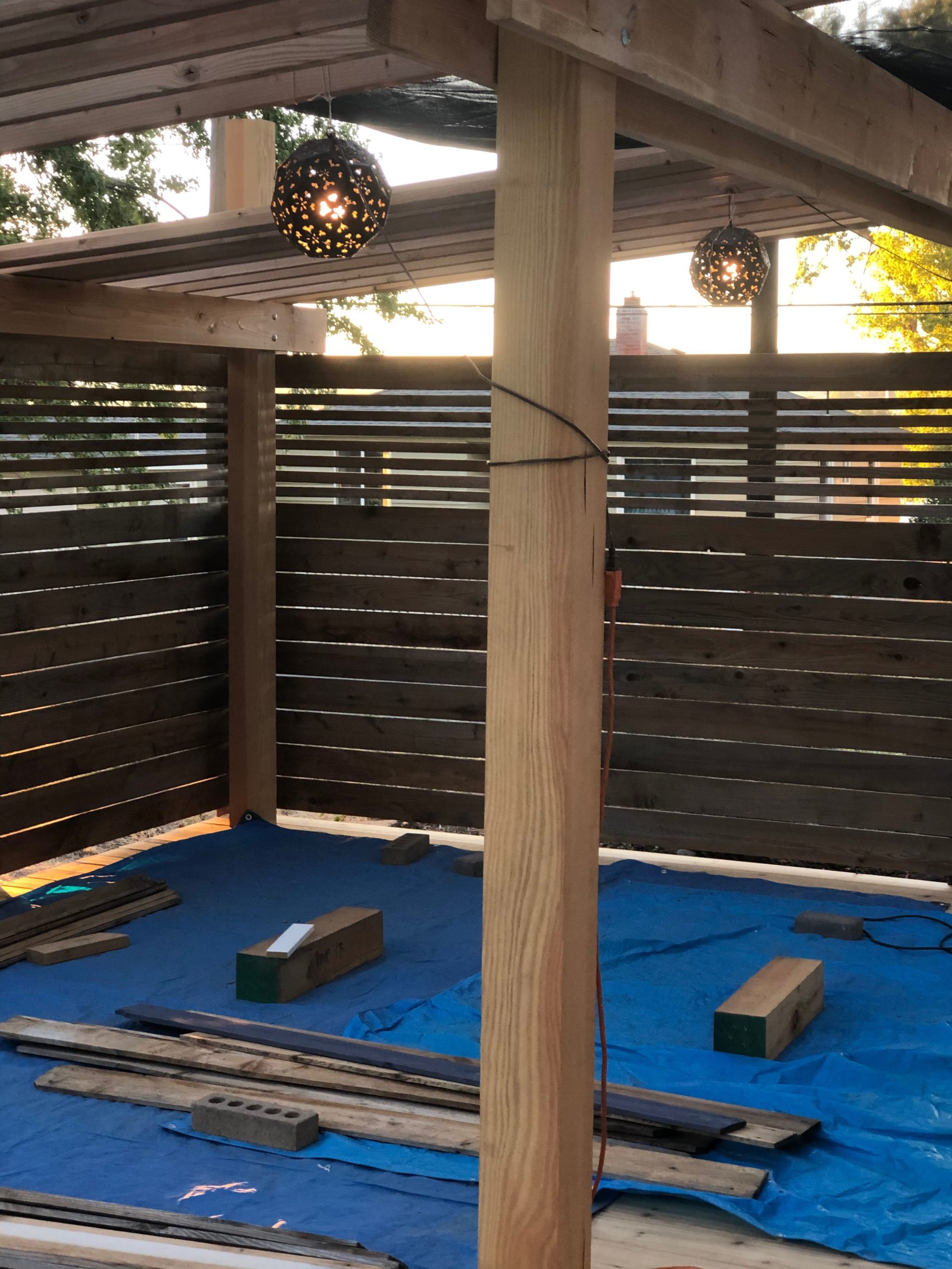 While we were working on the fence this day our new hanging lights came. We hooked them up with extension cords to see how the space looked. This shot also gives a good view of the spacing on the fence panels.