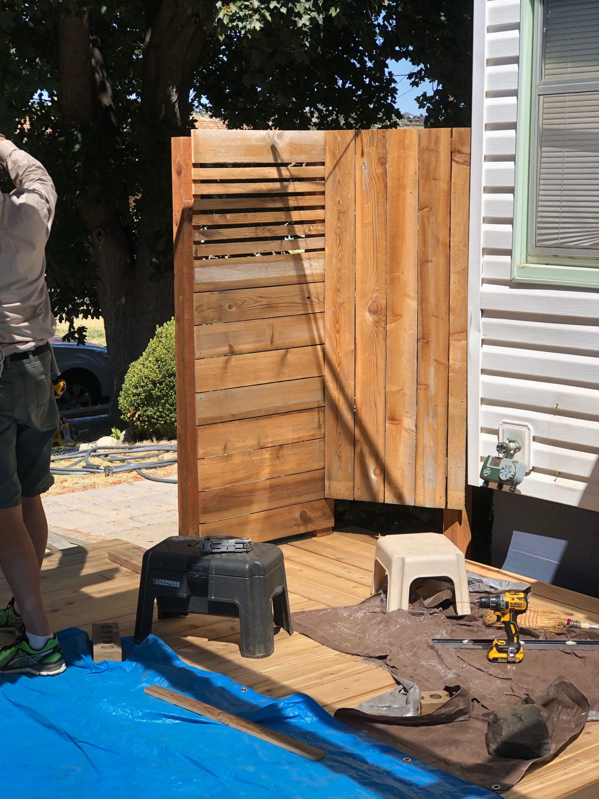 We let those dry out then got back to work installing them. We started by planning to use our horizontal/vertical pattern but once we got the first section in we changed our minds. We both decided that keeping it all horizontal would look better. We also decided to just attach them to each post which meant cutting them. We were really trying to avoid that but it was making the design more and more complicated. We did a quick calculation and counted our boards and decided we’d have enough, even with cutting them. We also decided to use full-width boards for part of the way up then switch to thinner boards spaced farther apart to allow for some ventilation. The thinner boards are a full board ripped into thirds. We also used our Camo tool (from the decking) for a 3/16″ space between the boards in the bottom section.
