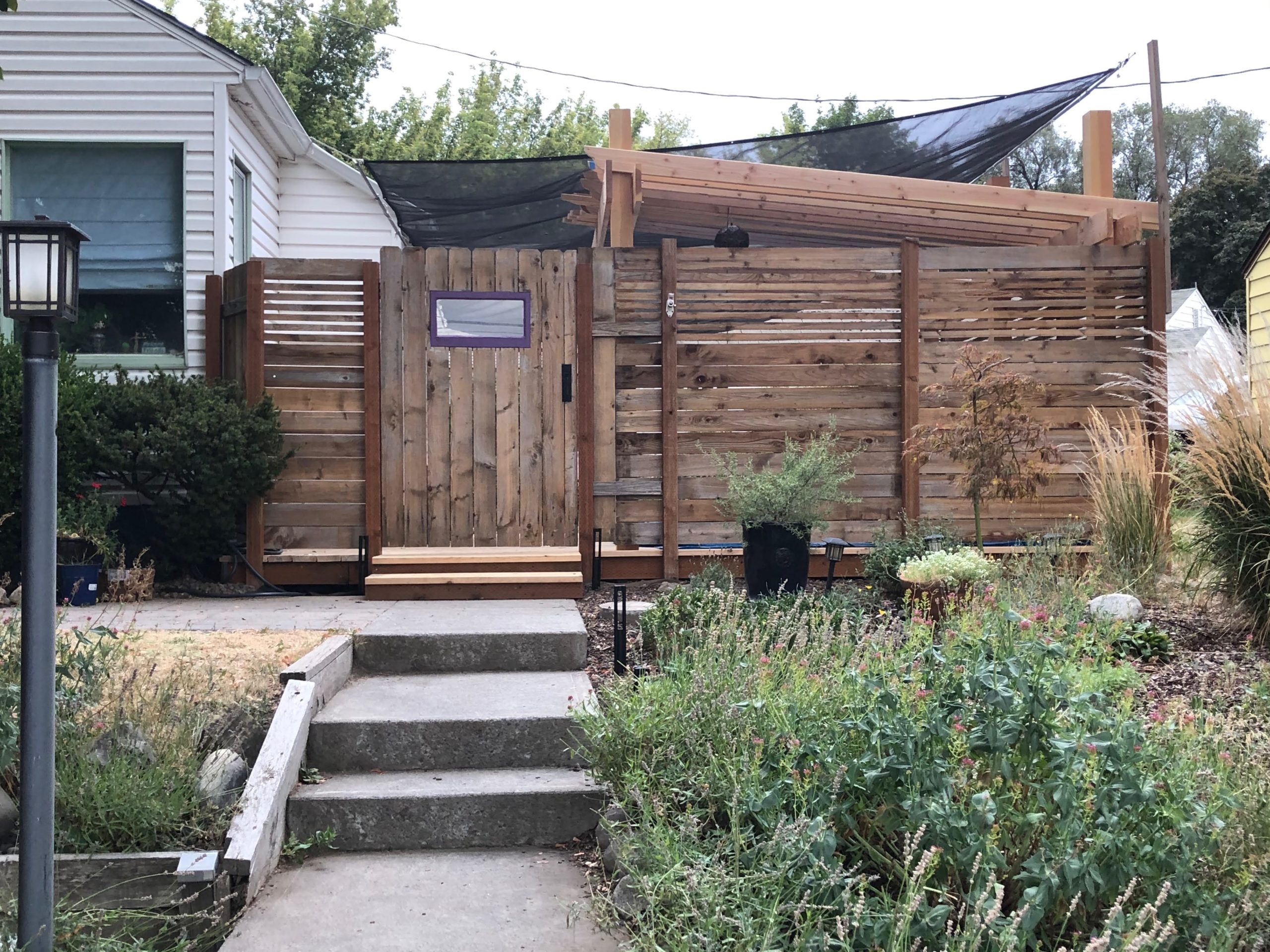 We had done some idea-hunting online and both liked the idea of using some horizontal fencing. We settled on a plan to do alternate sections of horizontal and vertical fencing, and do it in a way that would allow us to use the original fencing material. Given the cost of the project so far we really didn’t want to get rid of all of that wood (over 80 fence boards) and buy all new cedar fencing. As you can see in the shot above the old wood was grey, dirty and not very appealing. We have some purple highlights on the base of our house and in the fence so we thought one option is to just paint it and not worry about keeping the natural wood color. Here’s a mock-up we created: