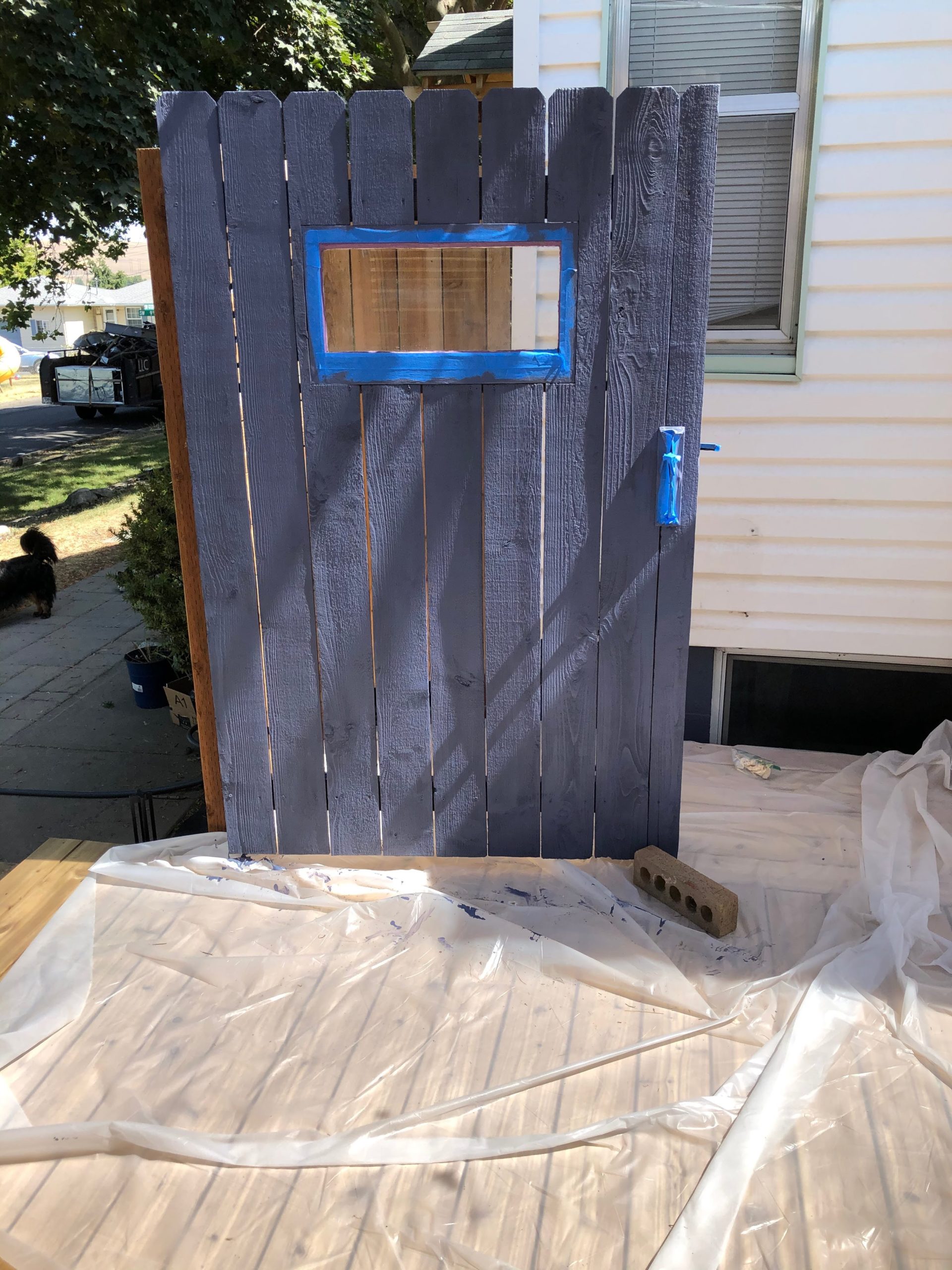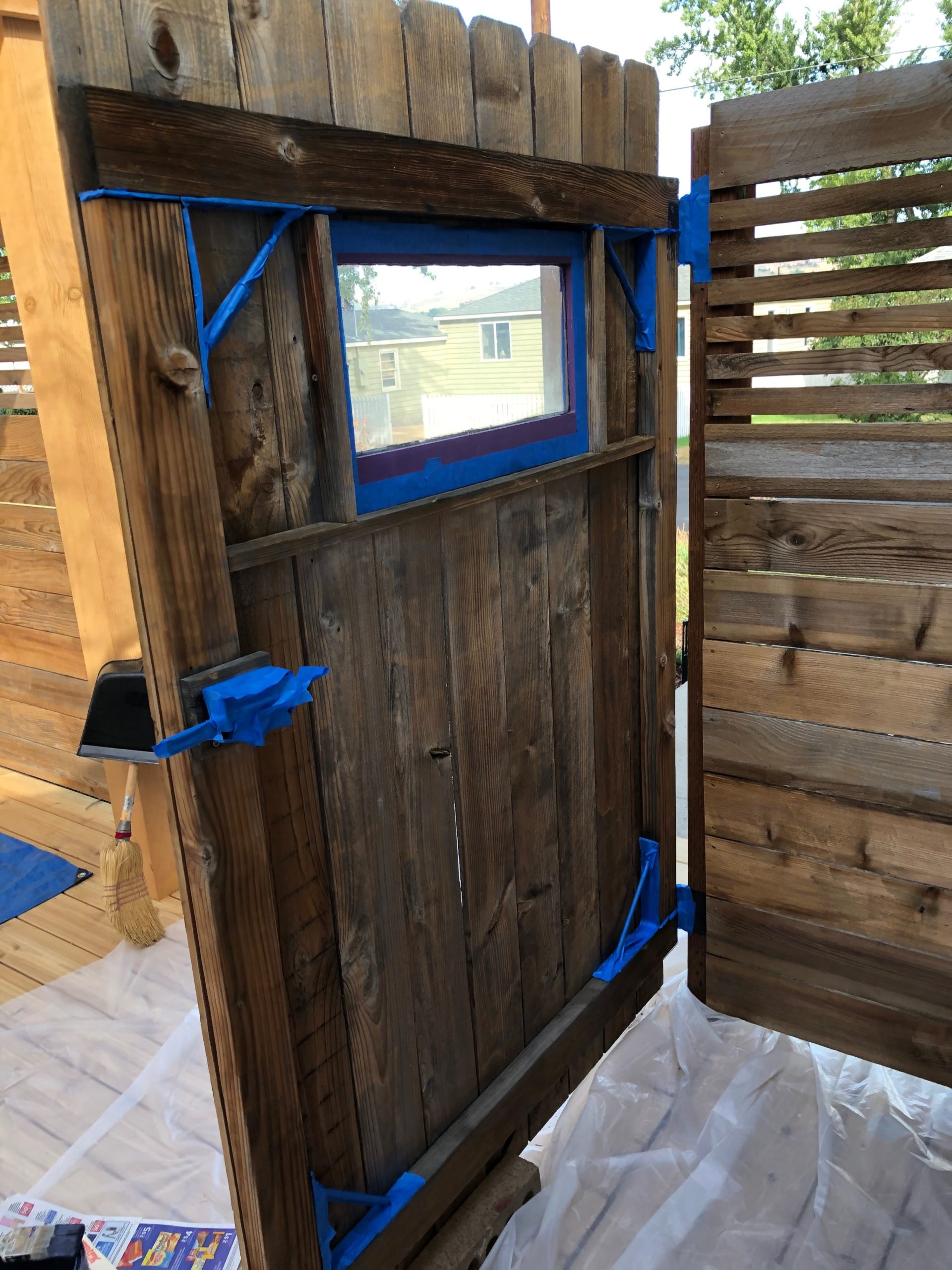 The final step for fence assembly is to install the old gate. We had forgotten to clean that so got the pressure washer back out and the gate cleaned up nicely. We are still thinking about what to do with the main part of the fence (paint or stain) but we both liked the idea of using our purple highlight on the gate. We had already included a purple window when we originally built it. Notice that the boards are vertical here. It was already built and didn’t want to take it apart and rebuild it.